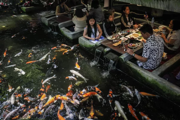レストランの池で泳ぐ鯉を眺める客(タイ・チェンマイ、12日)