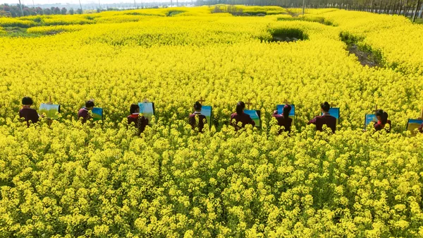 菜の花畑でスケッチをする学生たち(中国・江蘇省海安市、28日)