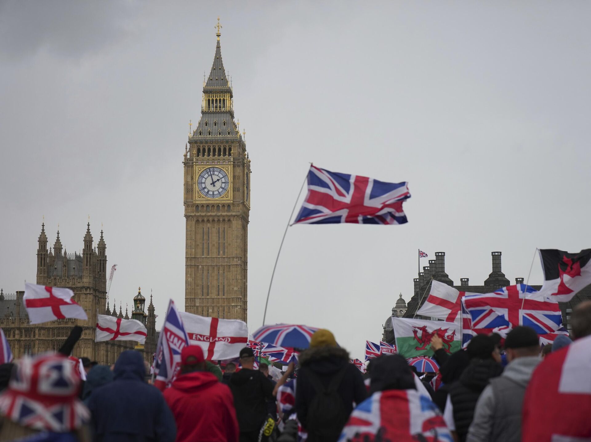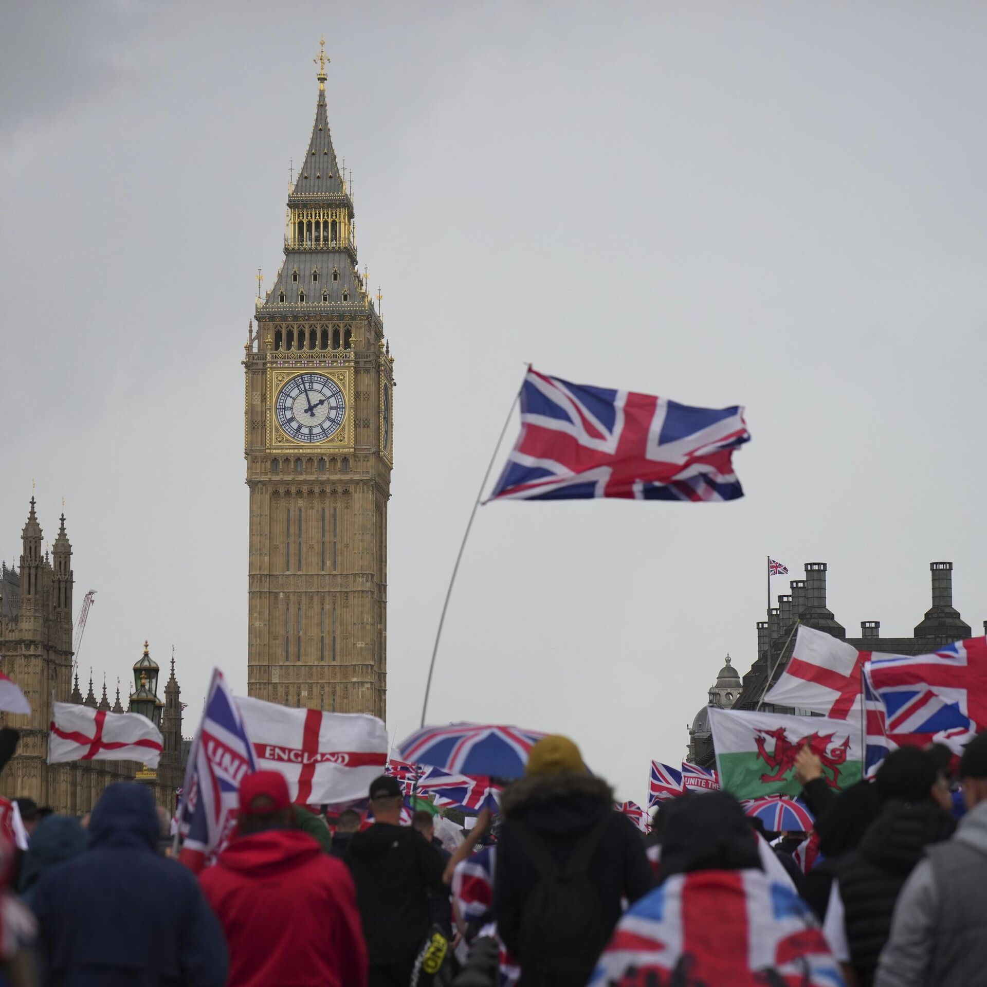 英ロンドンで13日、「ユナイト・ザ・キングダム(王国を一つに)」という名前の集会に大勢の右派支持者が集まり、英政府機関が集まるロンドン中心部ホワイトホールに向かった。参加者たちは、スターマー英首相に反対するスローガンを叫び、政府の移民政策と言論の自由の制限を批判した。 2025年9月14日, Sputnik 日本