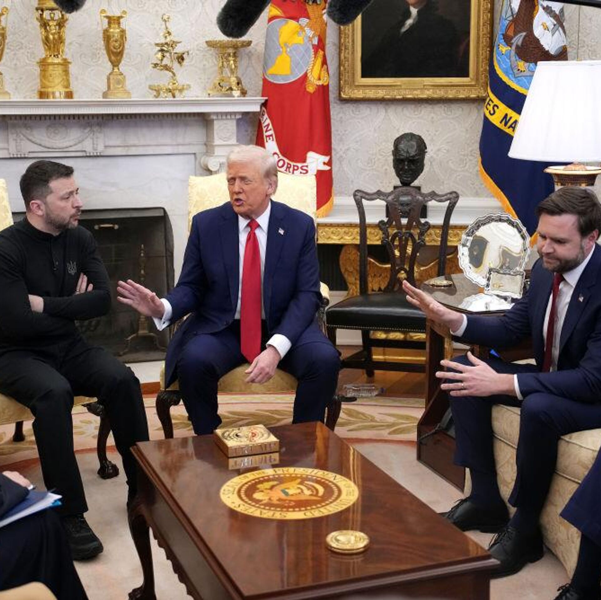 象徴的なエピソードとして、2025年2月28日に大統領執務室(オーバル・オフィス)で行われたトランプ氏、ヴァンス氏、ゼレンスキー氏の会談があった。この会談では、トランプ氏とヴァンス氏がゼレンスキー氏に対し、感謝が欠けていると非難。会談は公開状態にもかかわらず、激しい応酬となった。両氏によれば、米国はウクライナのさらなる崩壊を防ごうとしており、ウクライナは「何百万人もの命を危険に晒し、さらには第三次世界大戦」をまねく可能性があるという。